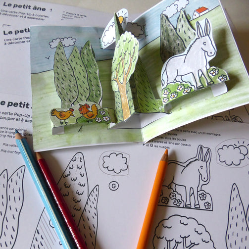 Simple à construire, cette carte est à colorier et à assembler pour révéler la structure 3D et donner vie au petit âne.