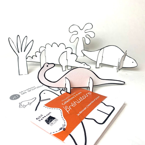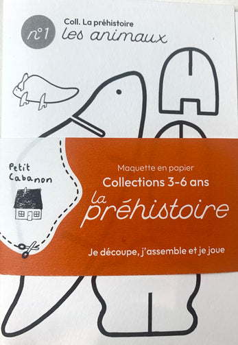 Cette maquette (10,5 x 15 cm) contient une feuille A4 pliée en quatre, avec trois animaux préhistoriques et deux arbres à construire.