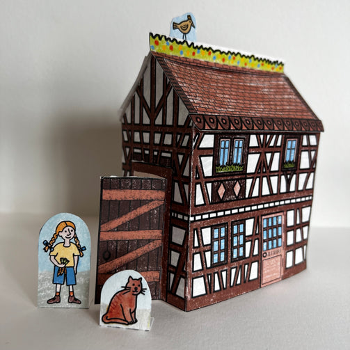 Cette maquette (10,5 x 15 cm) contient une feuille A4 pliée en 4 avec une ferme à colombage tout en couleur avec une petite fille et son chat